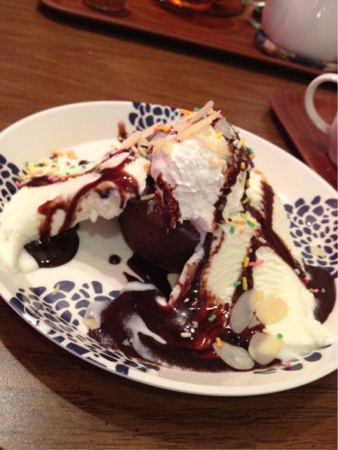 あまあーいクリームたっぷりなチョコレートケーキに、どらいふるーつを沈めた香り楽しむ紅茶!しかもポットで。(これ大事
