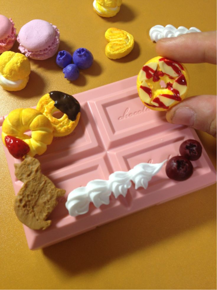 キャラメルとワッフルの部分は樹脂粘土、ハートのチョコはグルーでできてます。
