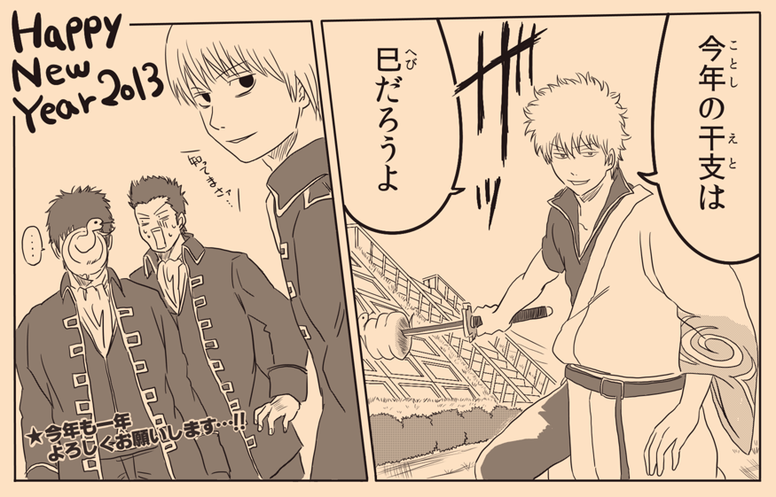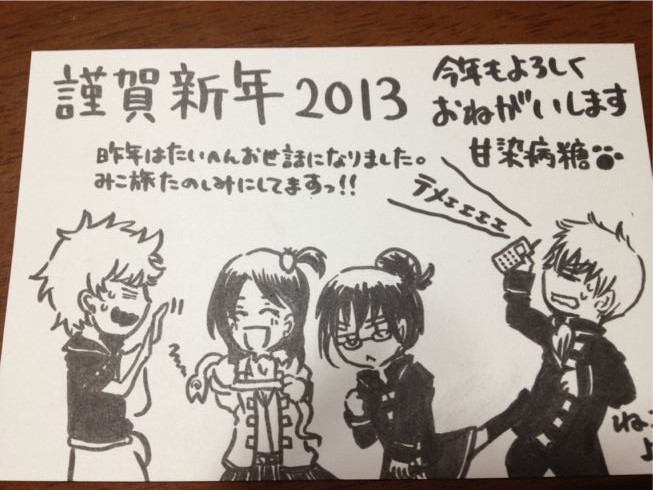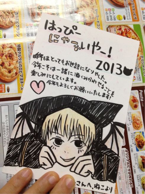 今年の年賀状のネタで困ってるあなたのために、ねこが年賀状テンプレ2013を落書いたので、